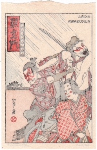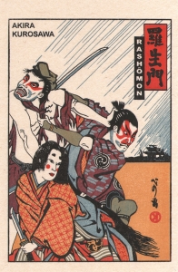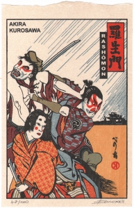 Cette gravure sur bois est conçue spécialement pour le coffret collector du film RASHÔMON d’Akira Kurosawa en version restaurée éditée par Potemkine. L’esthétique de la gravure puise ses sources dans l’imagerie des acteurs de théâtre de la fin du XVIIIe siècle au Japon. Les estampes illustraient les plus célèbres scènes du répertoire Kabuki, ses héros, et également ses acteurs.