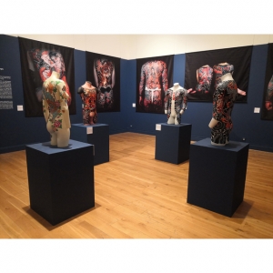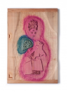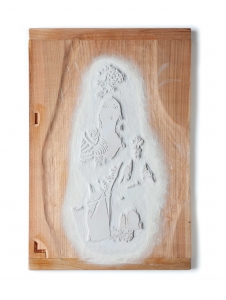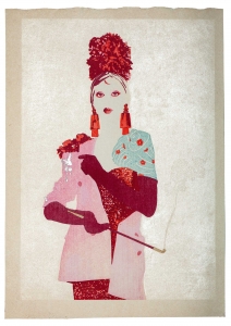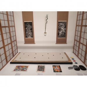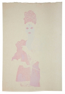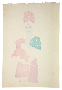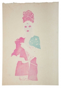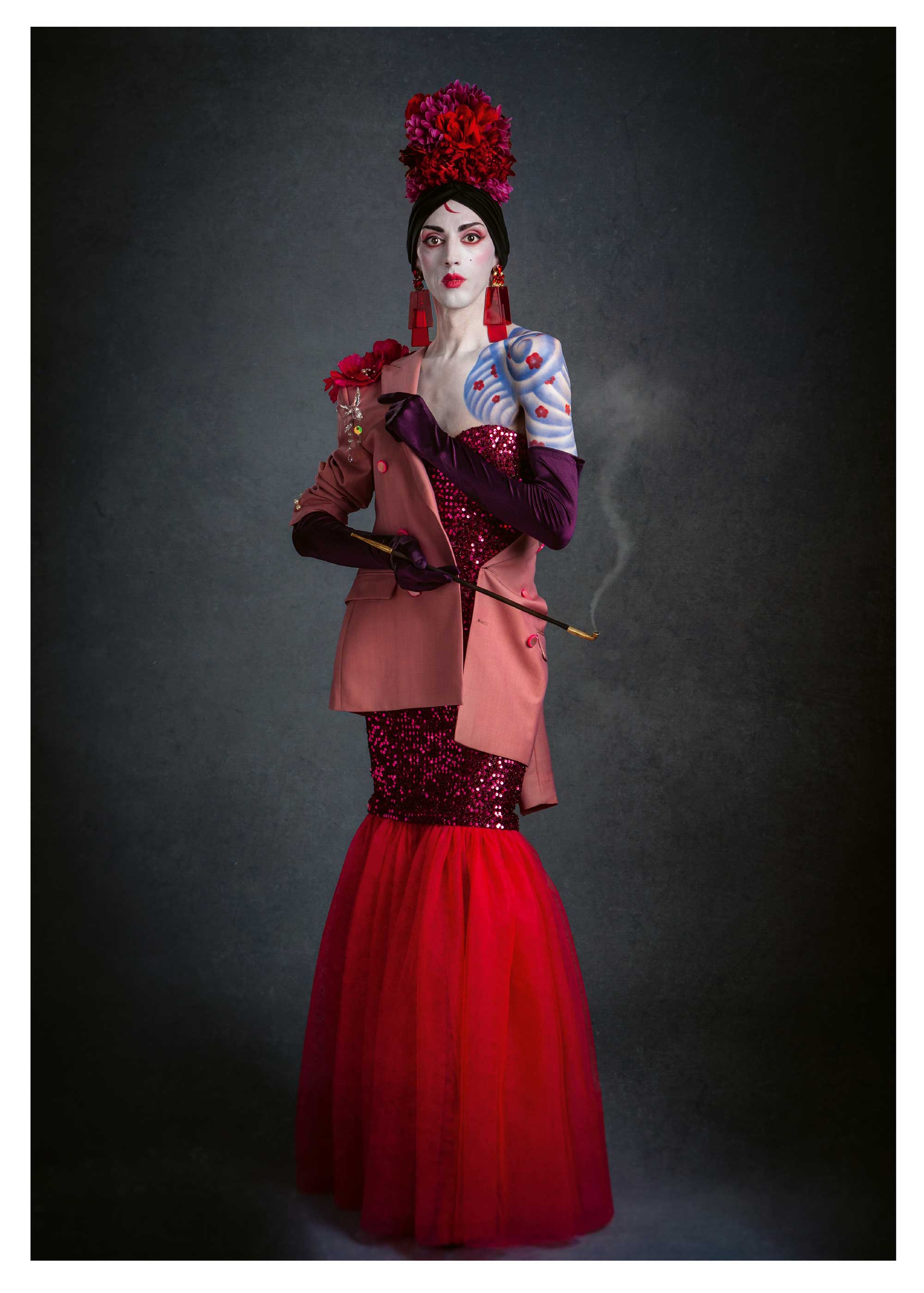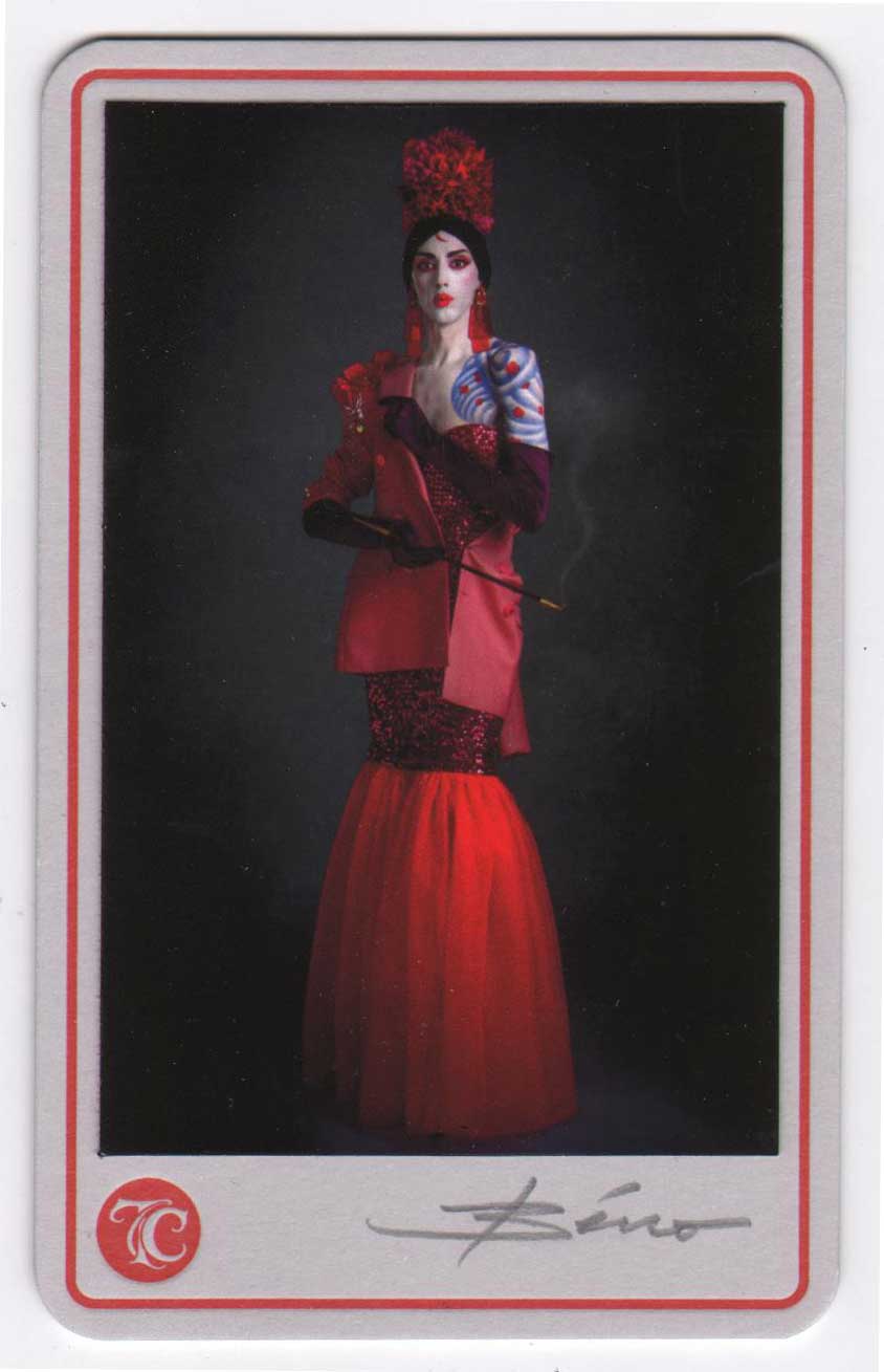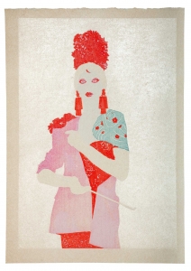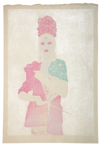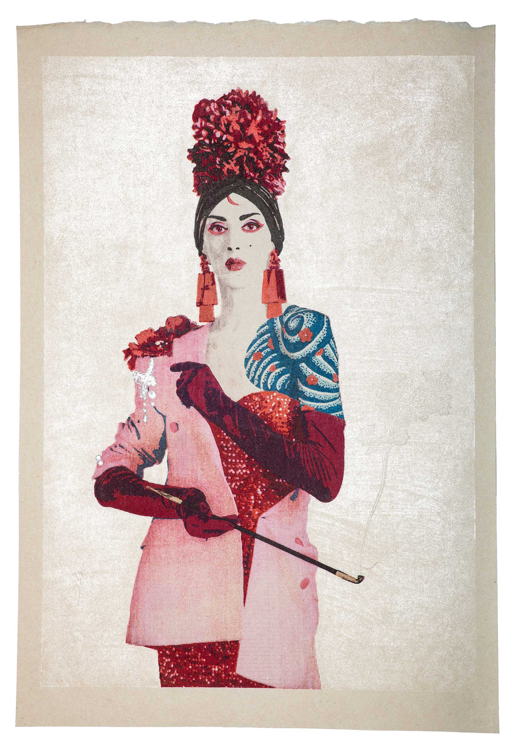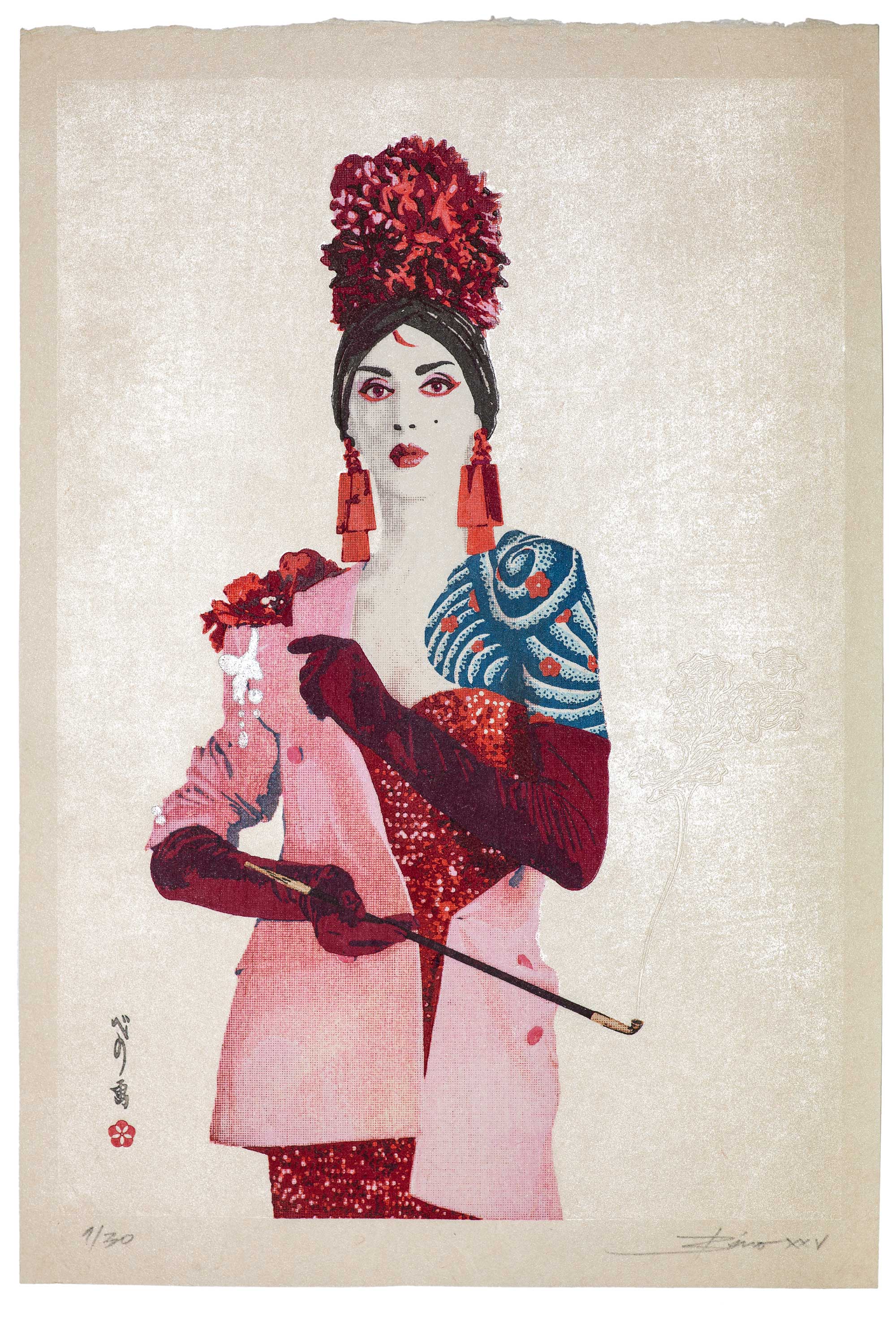 L’estampe Benten Kozō est une création exclusive pour l’exposition « L’art du tatouage au Japon » présentée au Musée des Beaux-Arts de Carcassonne du 21 juin au 28 septembre 2025. Béno explore le sujet des yakusha-e, ces estampes japonaises représentant des acteurs de kabuki. Récurrence dans ses créations, la photographie est aussi au centre de ses productions. Sa rencontre avec Florent Bidois, artiste, muse et créateur basé à Londres, l’incite à collaborer au projet autour de la figure de Benten Kozō Kikunosuke. Sous la direction artistique de Béno, ils organisent une prise de vue où Florent Bidois s’est approprié le projet en élaborant une tenue spécifique. L’ensemble du dispositif, les accessoires à l’instar de la pipe délicate, élément caractéristique du personnage, le maquillage simulant un tatouage et les poses sont captées par l’objectif du photographe Thierry Causera. Le cliché réalisé intègre ainsi les paramètres marquants de Benten Kozō dans une vision contemporaine gommant la différenciation sociale femme – homme aux accents occidentaux comme la « mouche », dite « la galante », ornementation du visage factice symbole de beauté. Tirage : 30 exemplaires 7 matrices en bois de hêtre 16 passages couleurs avec effets de gaufrage (karazuri ) et fond micacé (kirazuri ). Papier Japon nishinouchi, 60 gr Format papier : 36,5 x 25,5 cm Format visuel : 33 x 22,9 cm